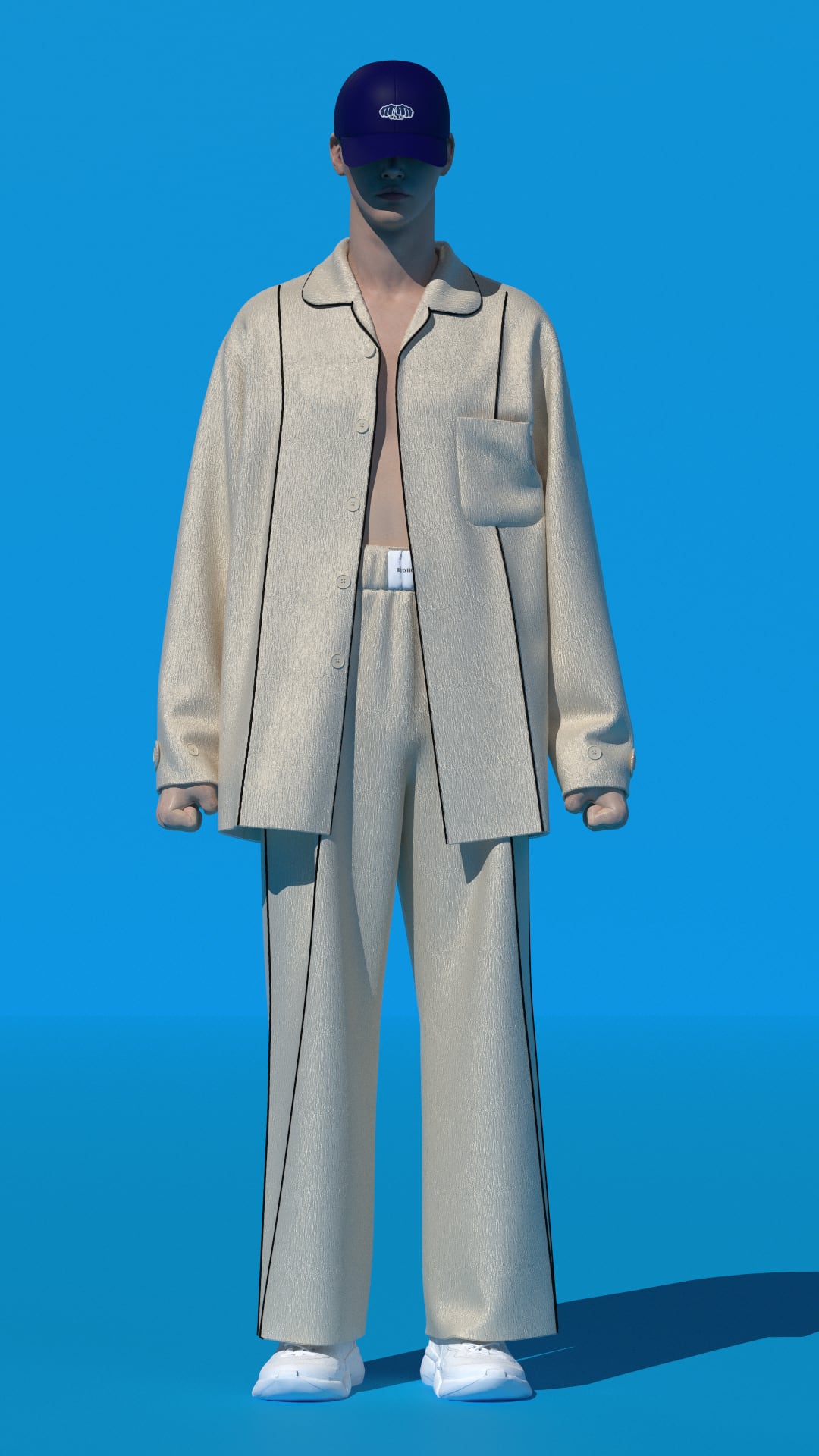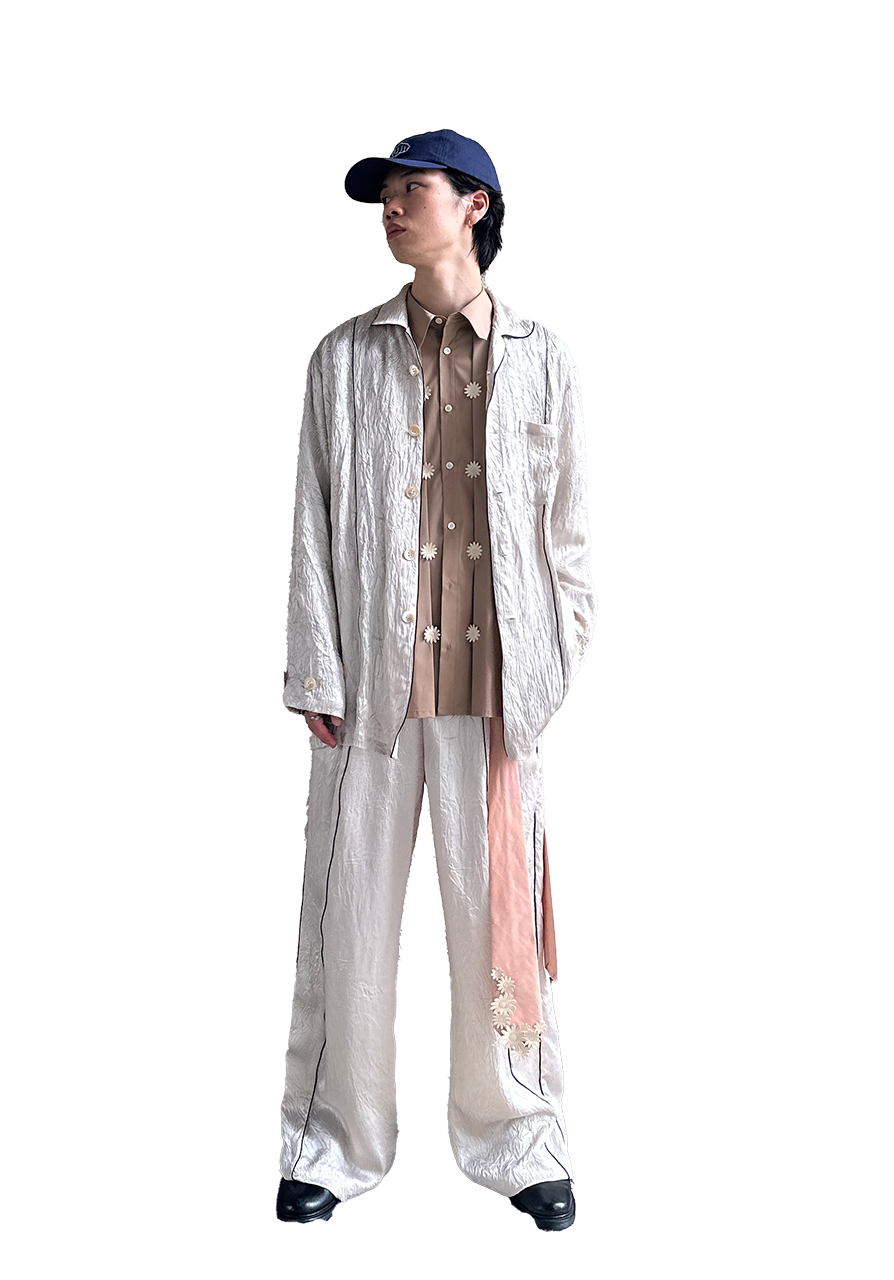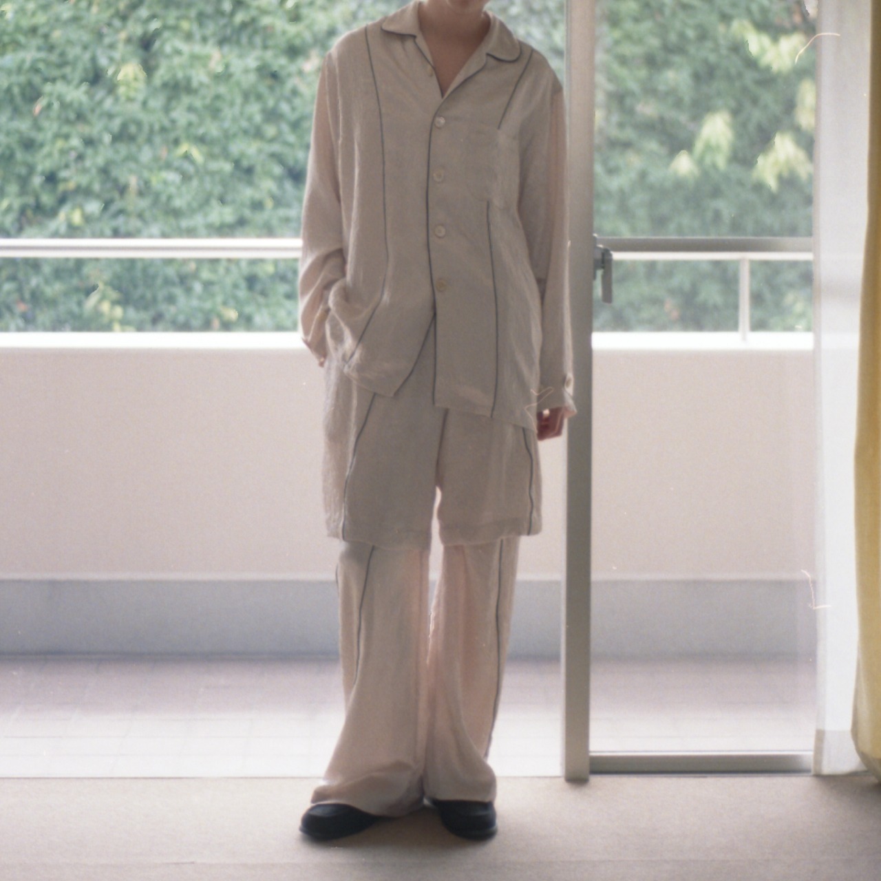 前端、衿、切り替え部分には配色パイピングを施し、クラシックなパジャマディテールを際立たせつつ全体を引き締め、モードな印象を演出。ルームウェアの快適さとシャツとしての洗練を両立しています。