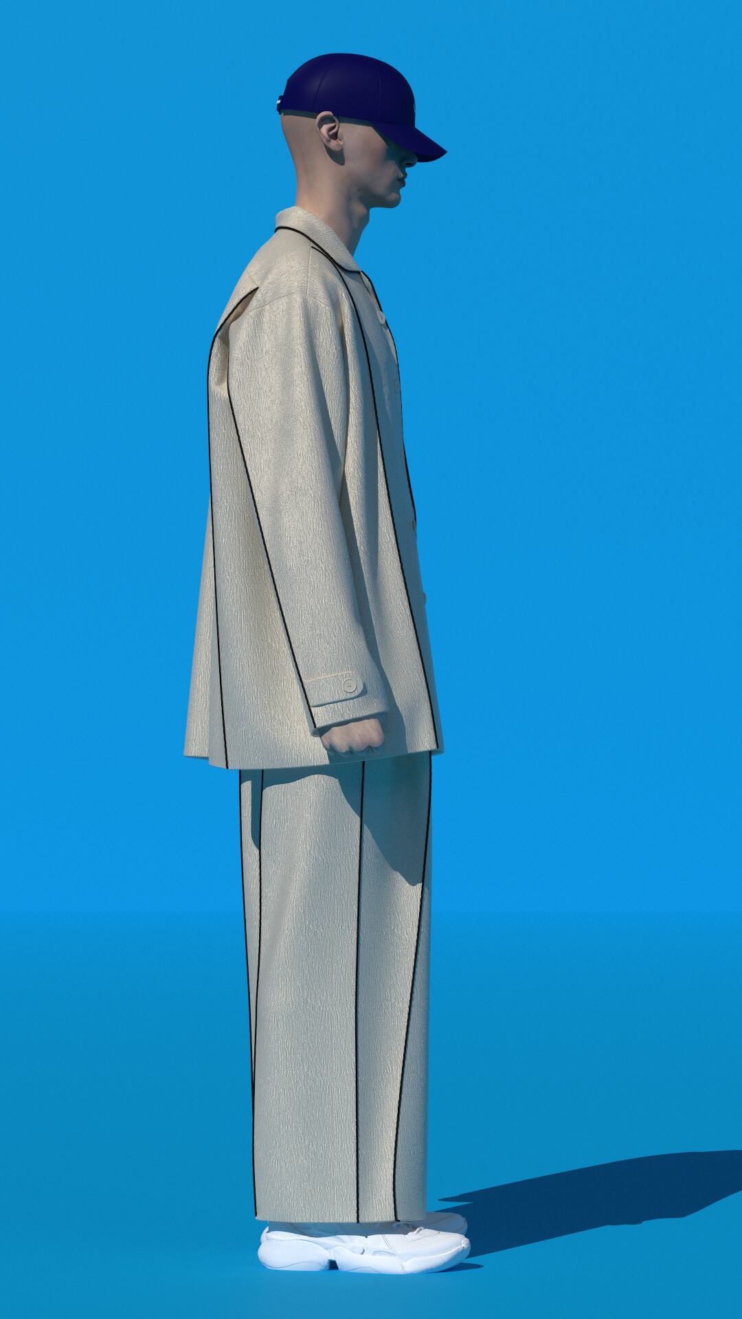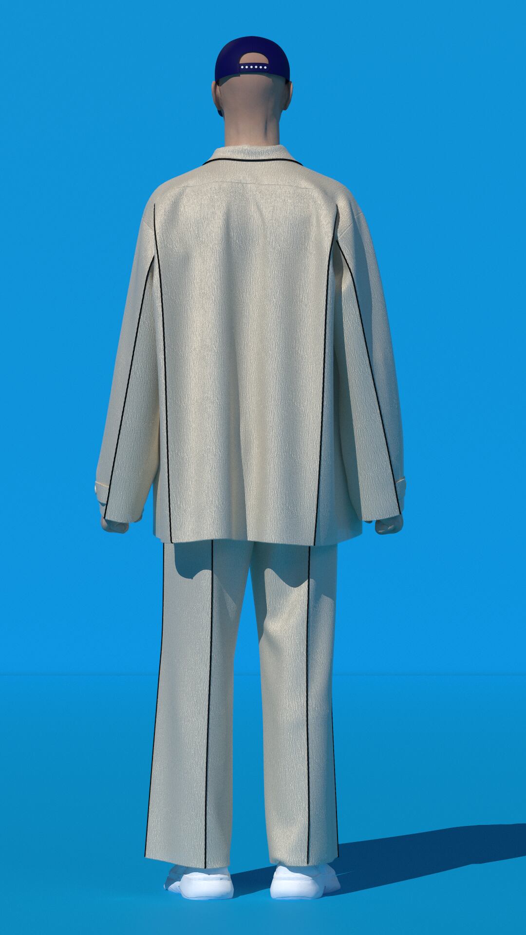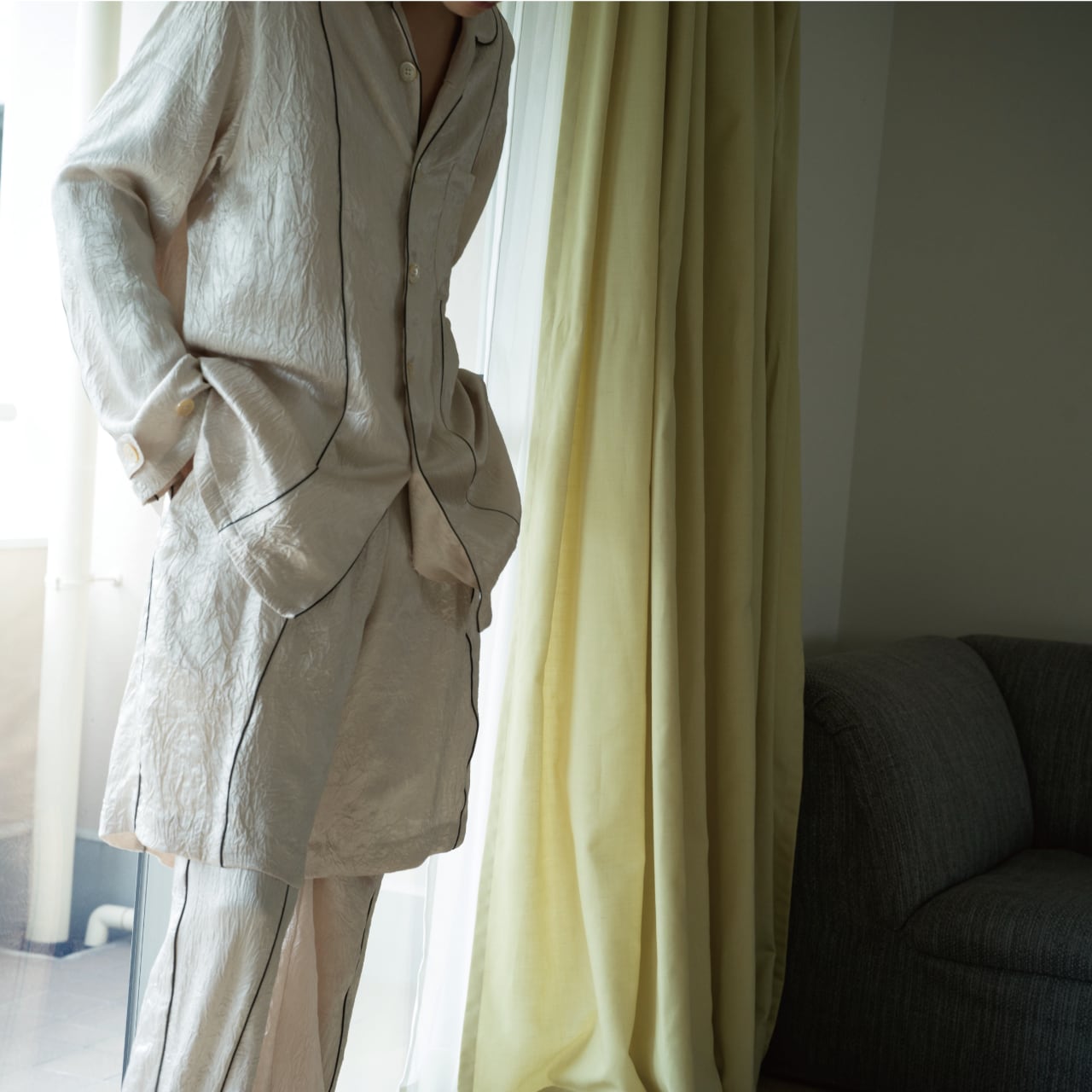 サイドとセンターの切り替え部分には配色パイピングを施し、クラシックなパジャマディテールを際立たせつつ、全体を引き締めモードな印象に。