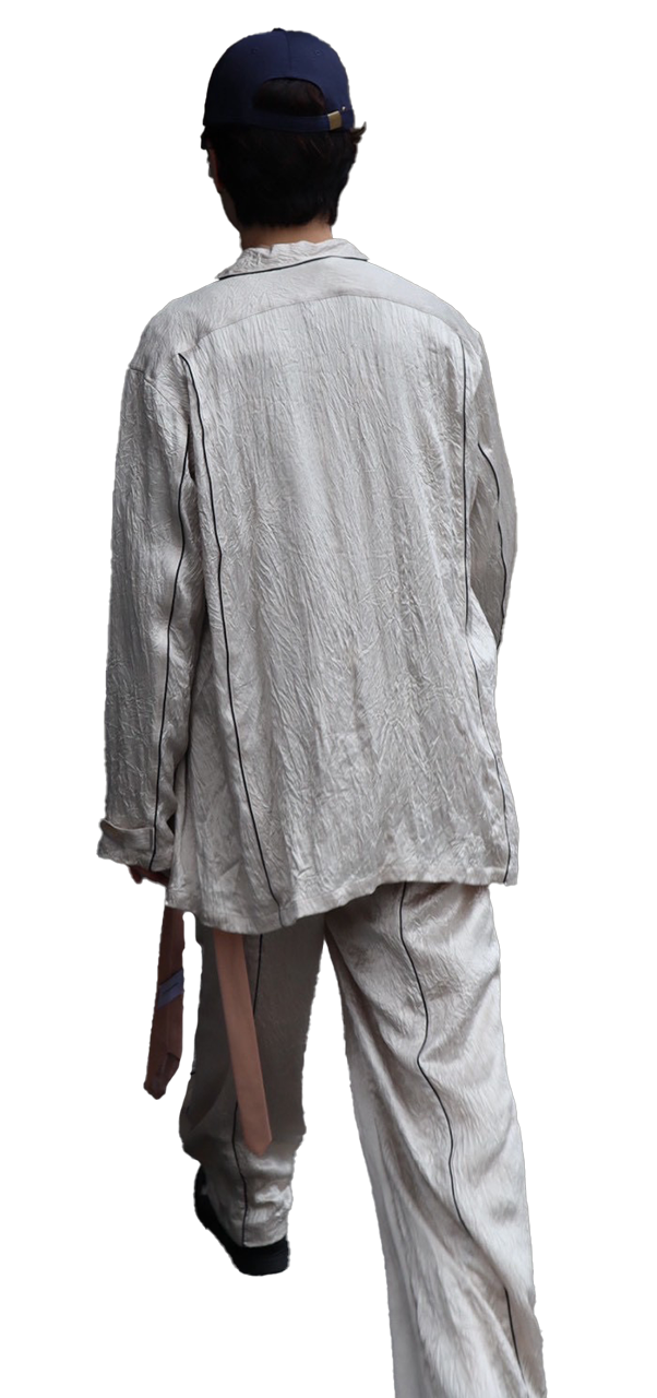 上品な光沢ととろみのあるドレープが特徴のアセテート100%素材を使用。さらに手間をかけた二重シワ加工により、耐久性の高い立体的で深いテクスチャーを実現。動くたびに光を不規則に反射し、豊かな陰影を生み出します。