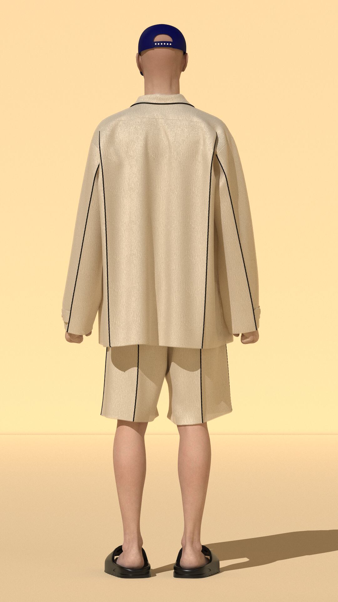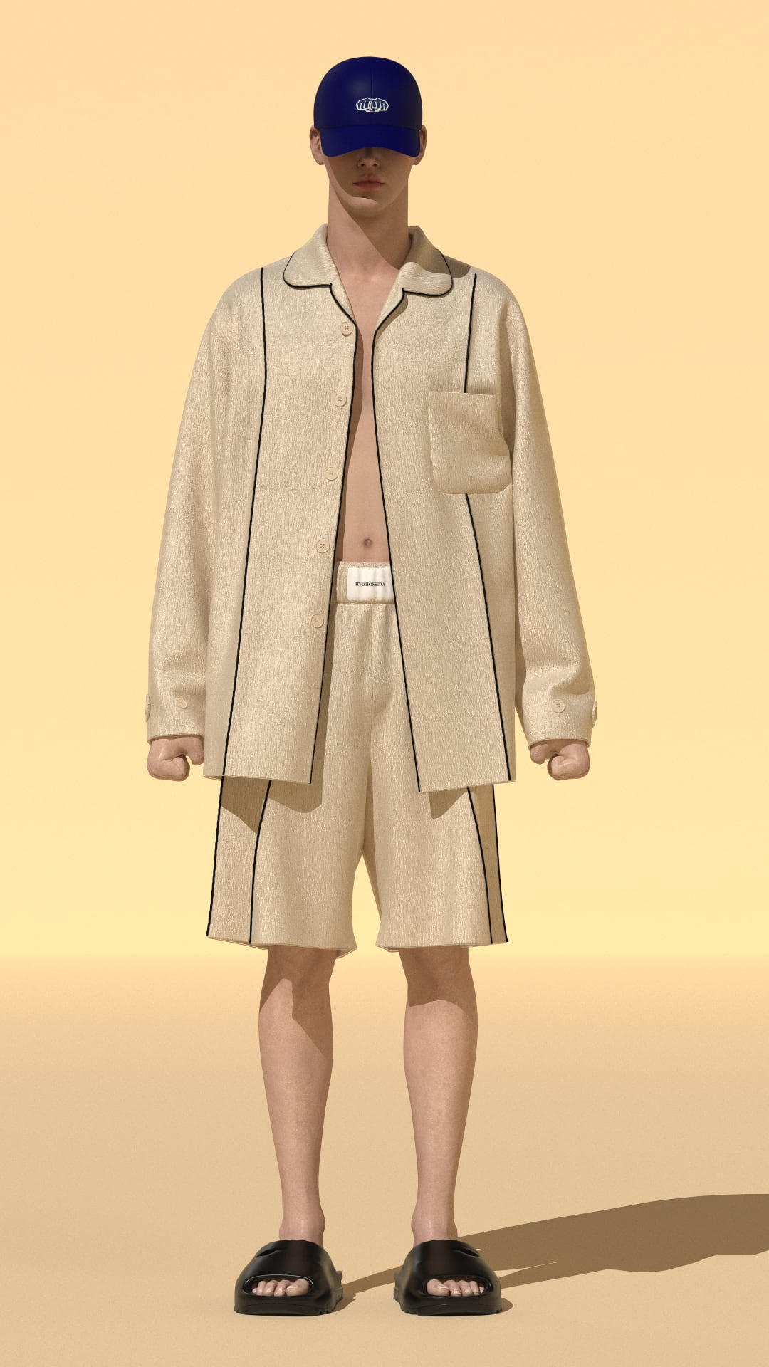 サイドやセンターの切り替え部分には配色パイピングを施し、クラシックなパジャマディテールを際立たせつつ、全体を引き締めモードな印象に。