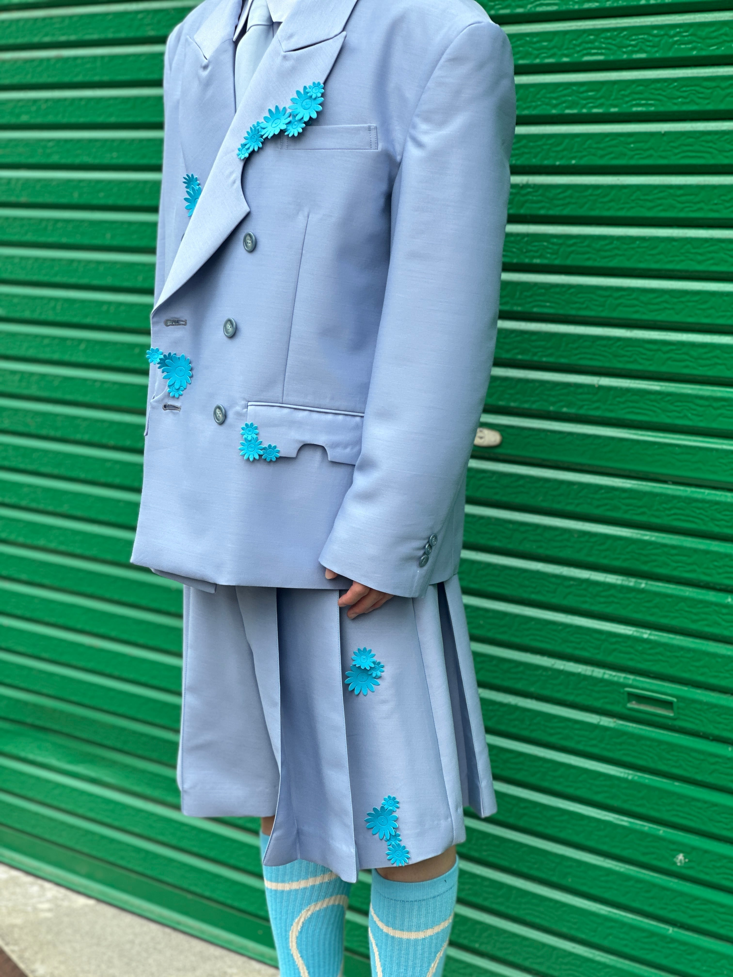 プリーツの奥には部分的にモチーフを施し、上質な生地の陰影と相まって、大人のためのモダンでユニークなアクセントに。