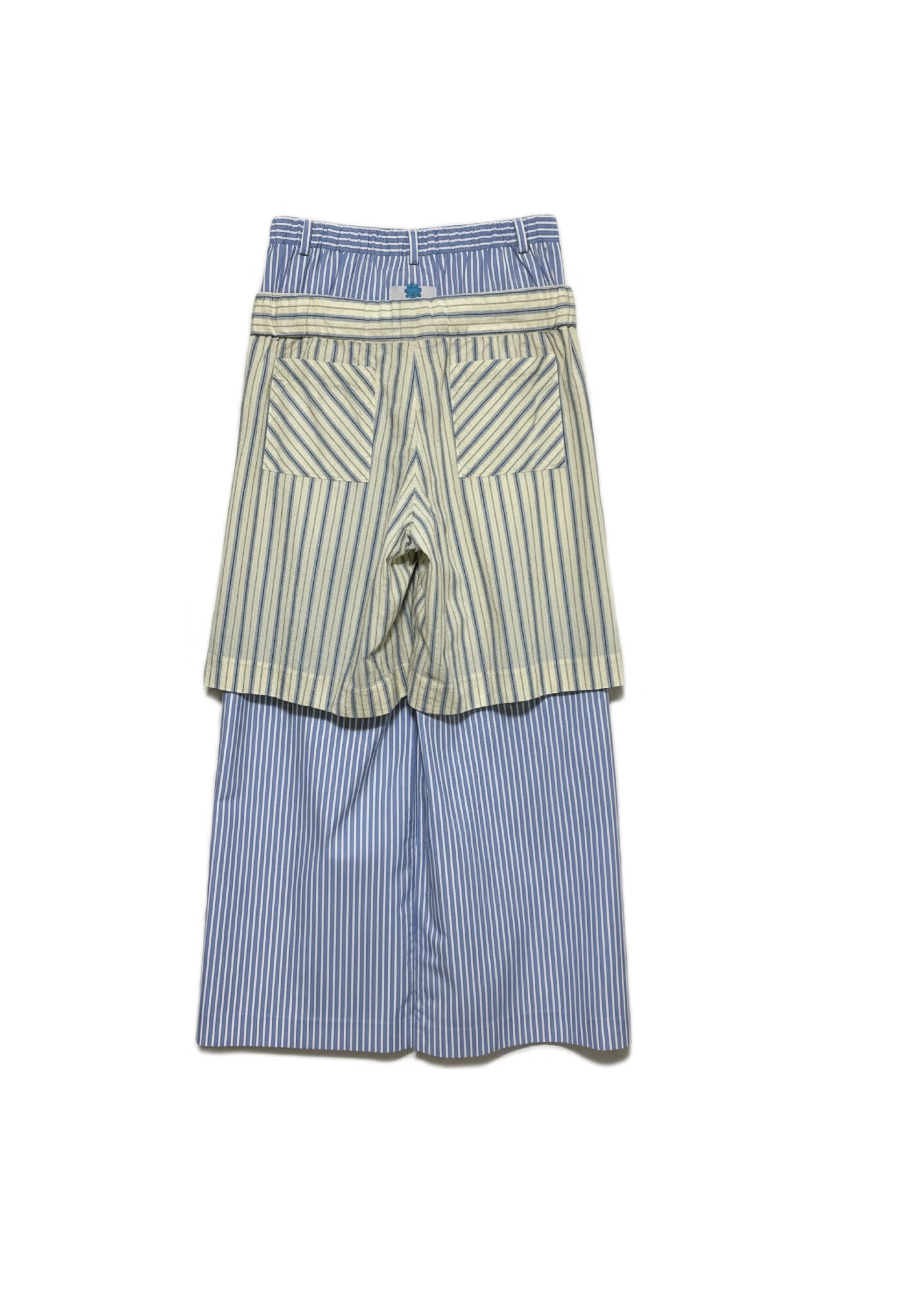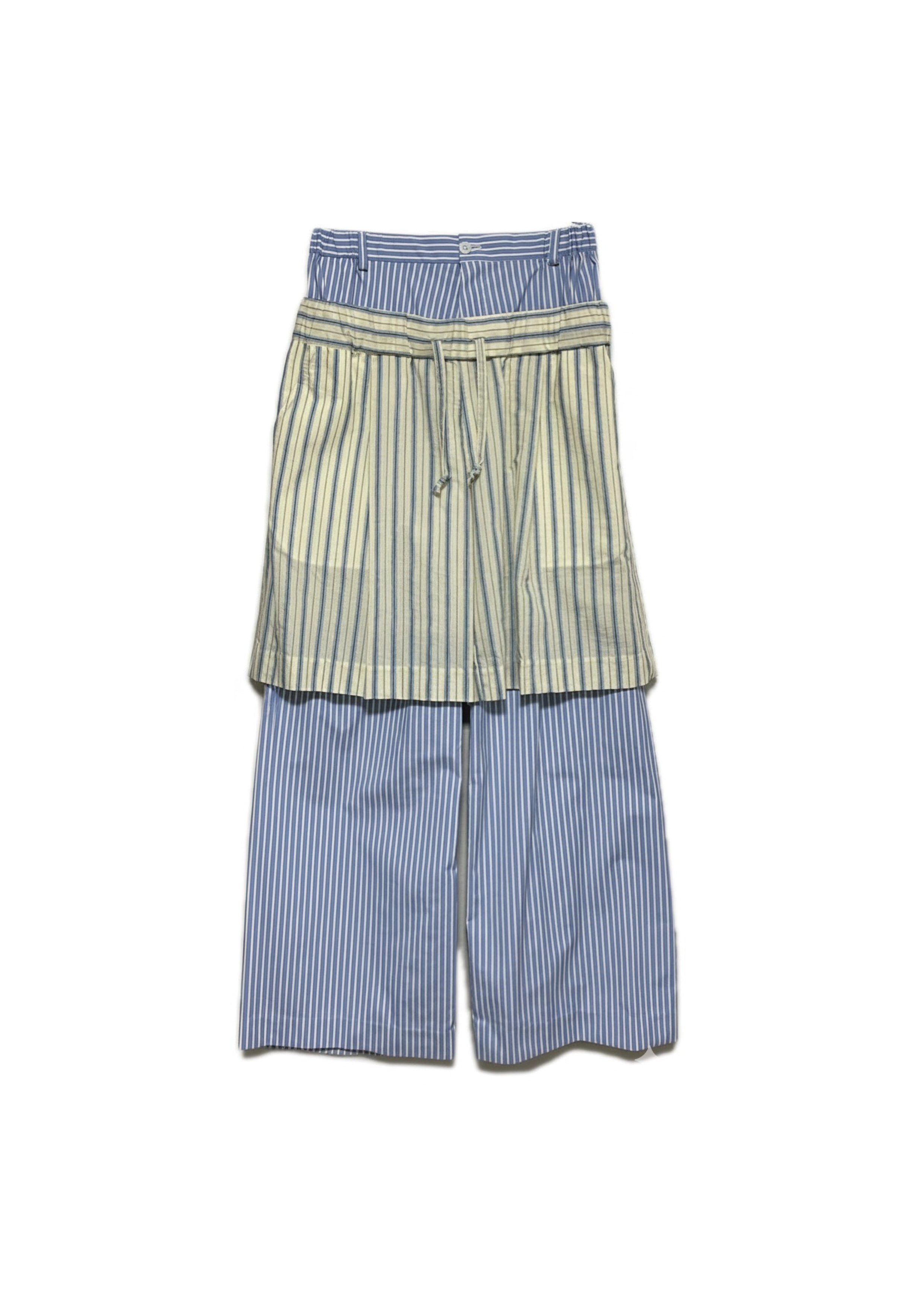重さを感じさせない軽快な素材で、一枚で複雑なレイヤードスタイルを実現したドッキングパンツ。