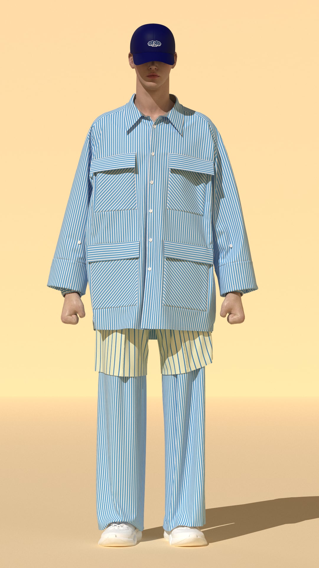 あえて薄手の2種類の清涼感あるストライプ生地を使用し、重ね着特有のゴワつきや重さを解消。