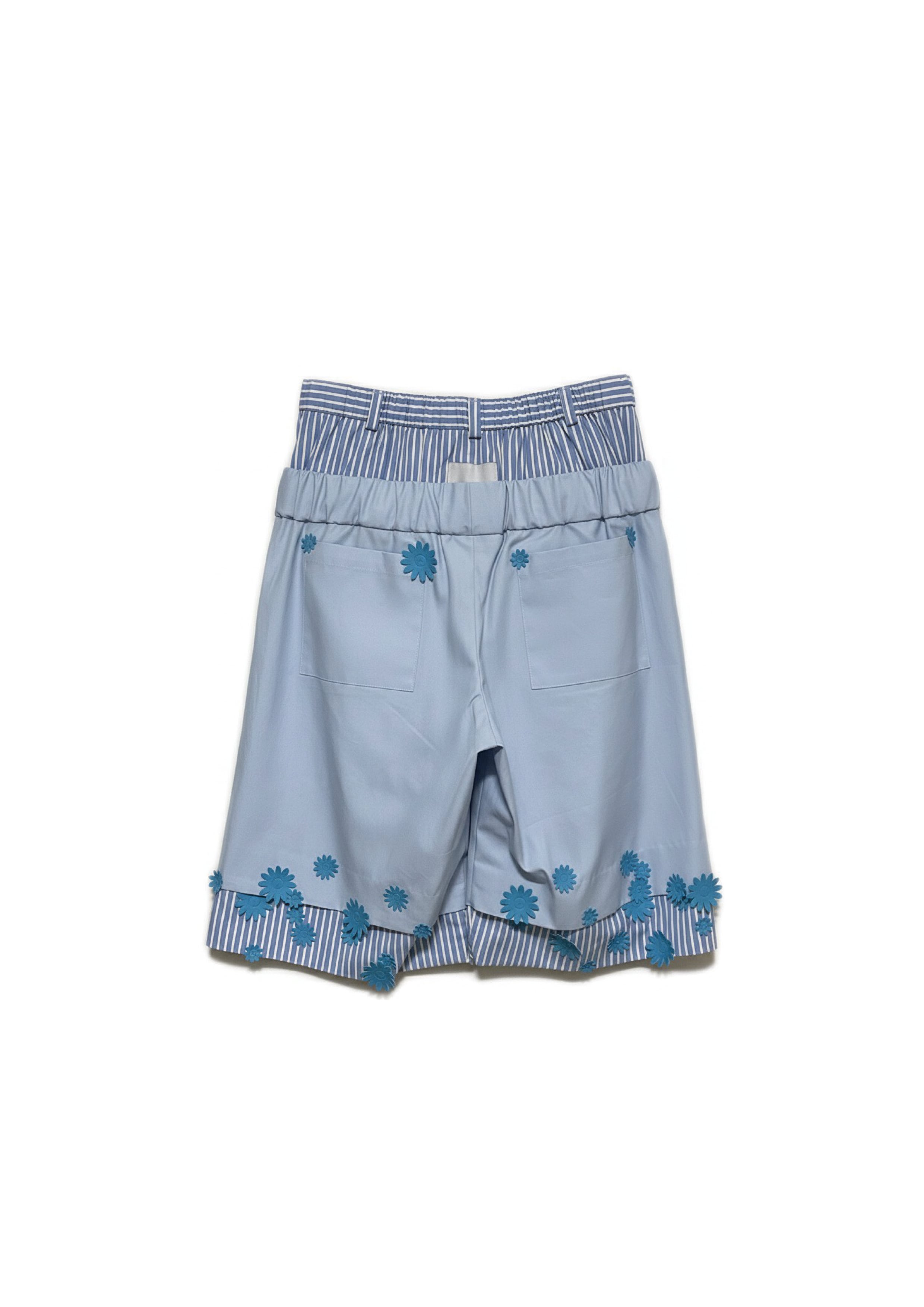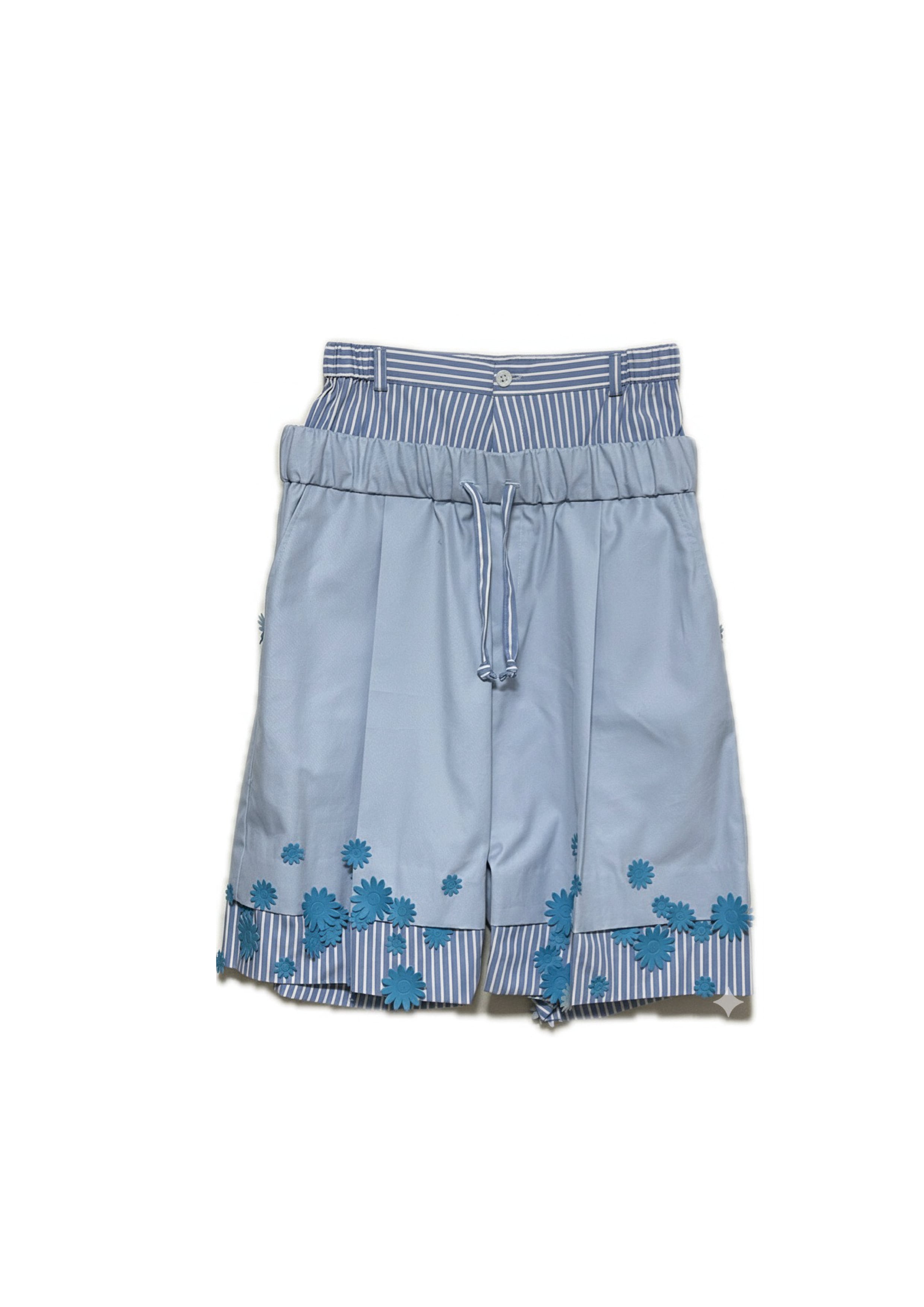 裾には繊細なフラワーモチーフのアートワークを施し、上層のトランクス型パーツから下層のストライプ生地にかけて、まるで侵食するかのようにランダムかつ立体的に配置。