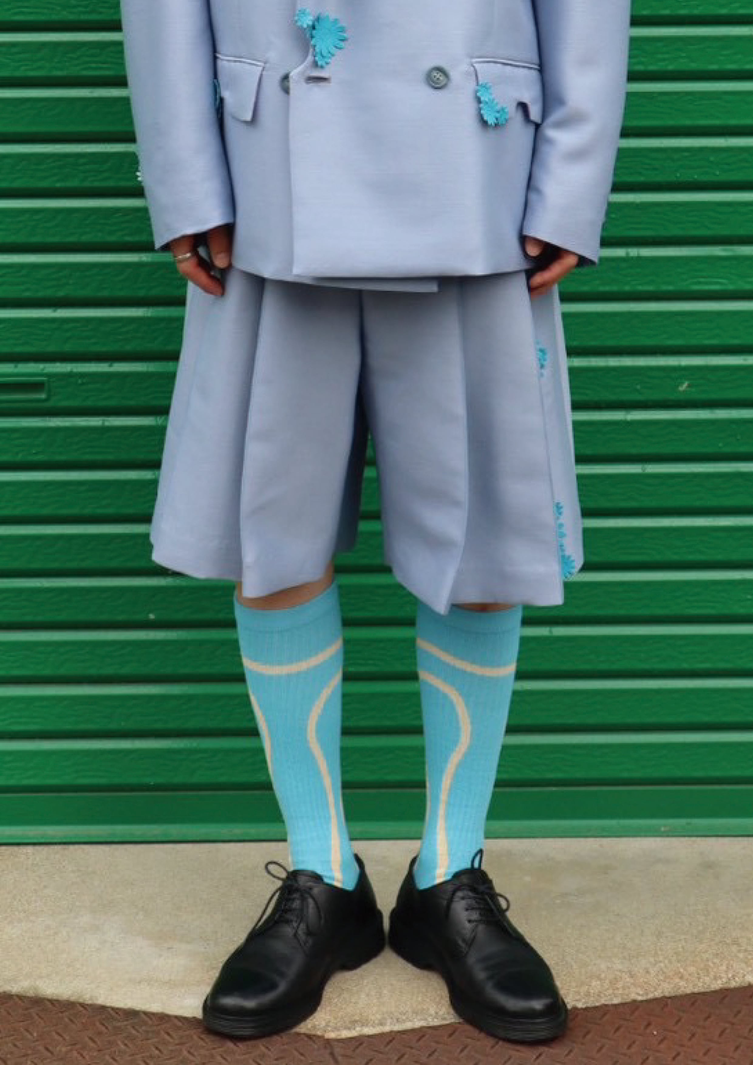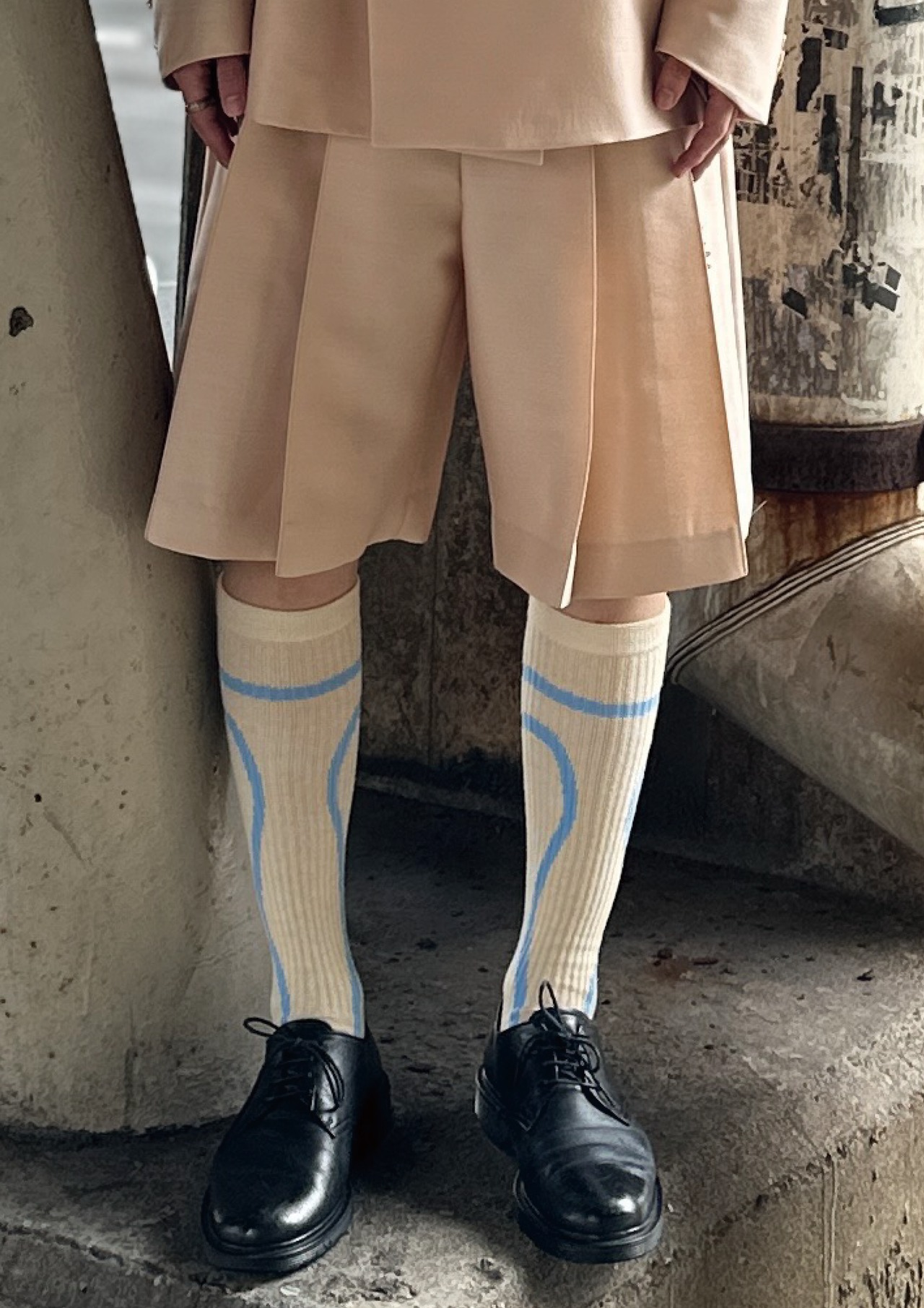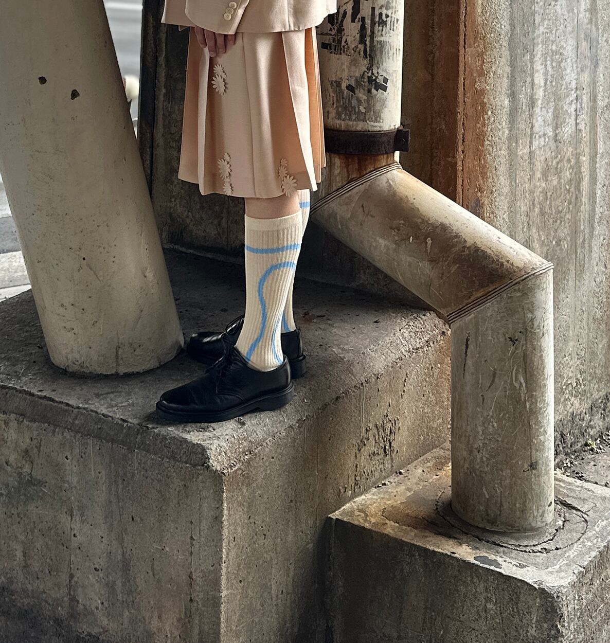 今季のシーズンテーマ「EROSION(侵食)」をイメージした、ベージュとサックスのバイカラーLONG SOCKS。