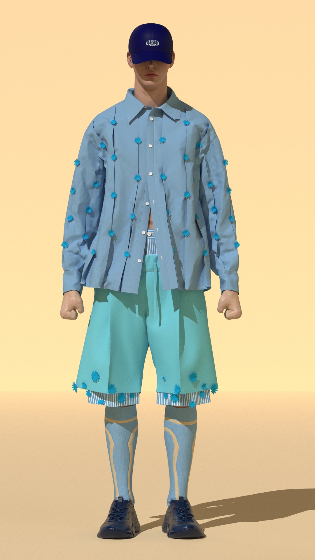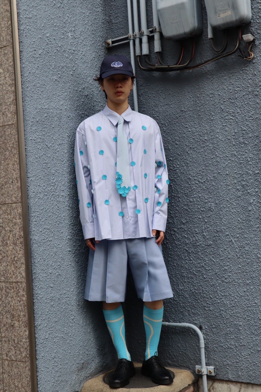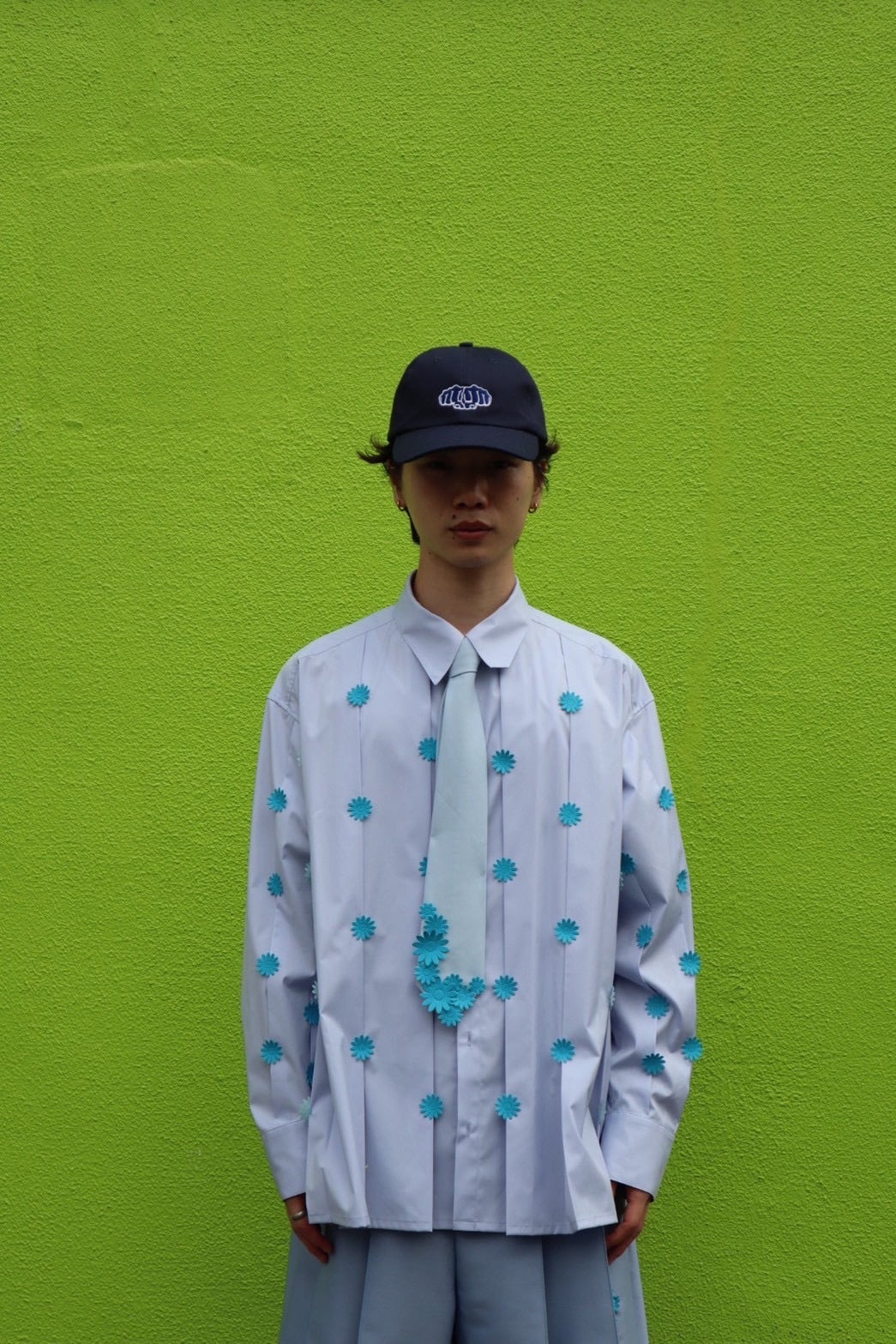 さらに衿先やカフスには侵食されたようなカッティングを施し、エッジの効いたディティールで遊び心をプラス。日常のコーディネートにアート感を添える一着です。